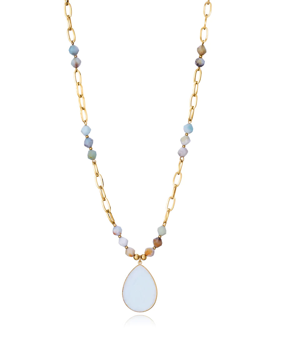 Collar de acero en Ip dorado, con piedra amazonita, larga 60,3cm con cadena ajustable hasta 64 cm. Cierre mosquetón.
