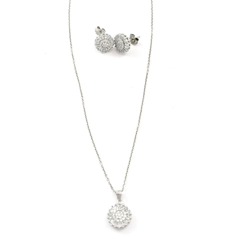 Conjunto de plata rodiada, circonita Swarovski, cadena de 45cm y pendientes con cierre presión.