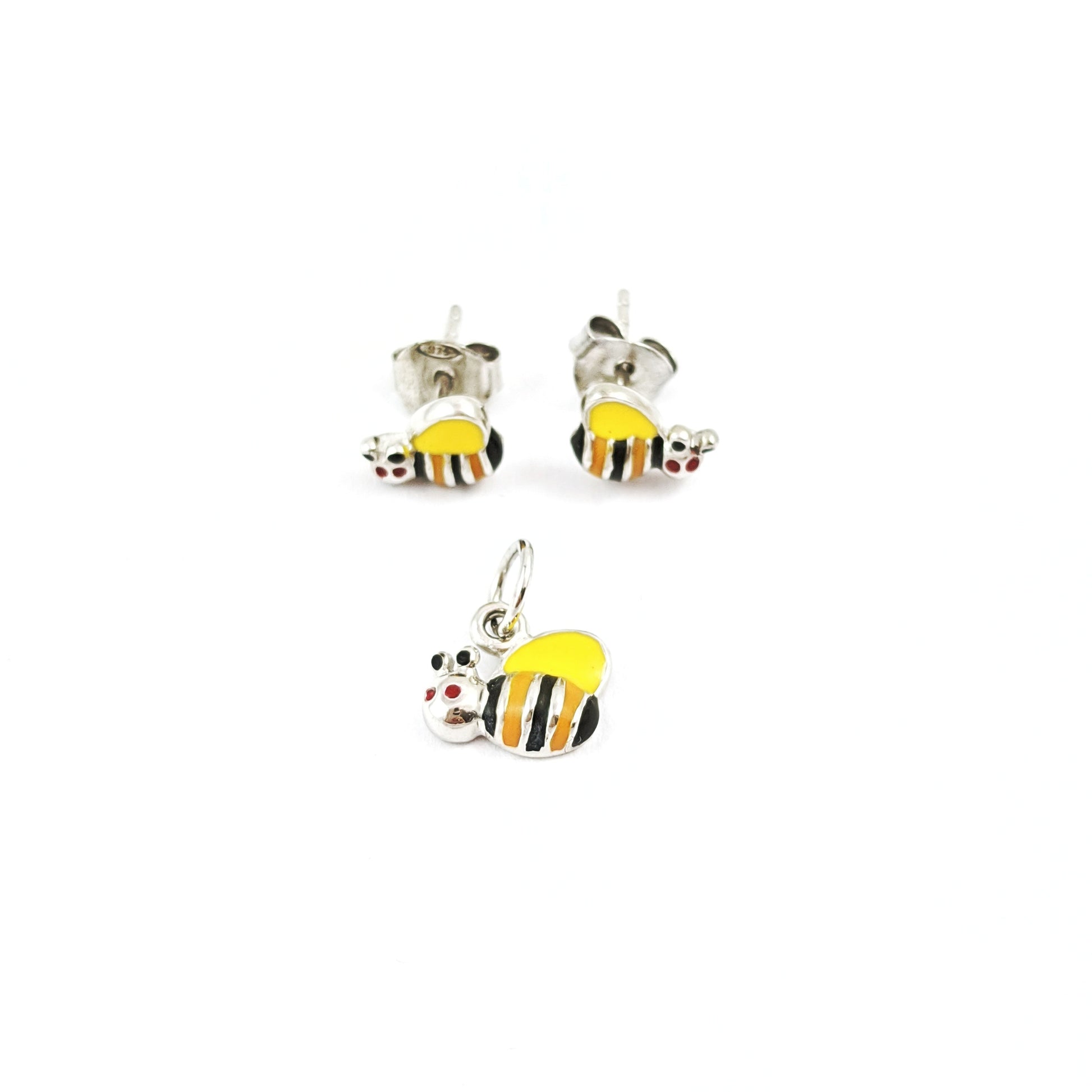 Conjunto niña de pendientes y colgante sin cadena en plata con forma de abeja, esmalte amarillo. naranja, rojo y negro. Pendientes cierre presión.